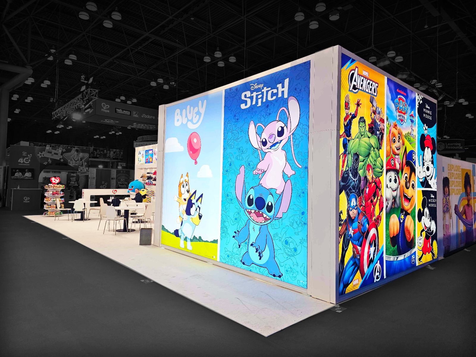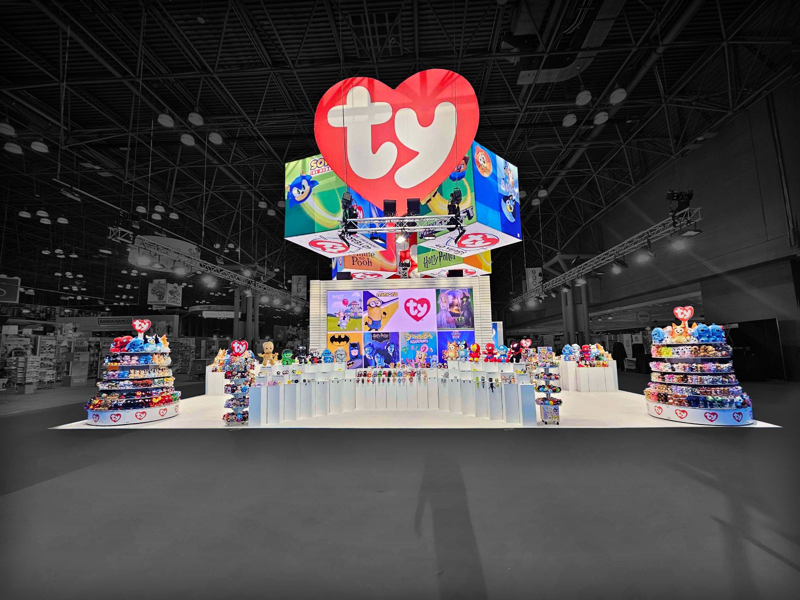 The experience began the moment attendees entered the exhibit hall, immediately captivated by the 50 by 55-foot island booth and a 20 by 50-foot inline booth positioned directly across from each other, creating a gauntlet that fully immersed visitors in the Ty-branded world. A large 10 by 18-foot LED wall broadcast the Ty message from outside the space while bringing characters to life in bold, vibrant motion. Overhead, four rotating backlit cube signs added dynamic movement, while glowing heart logos and sleek SEG panels reinforced a polished, modern aesthetic unmistakably Ty.